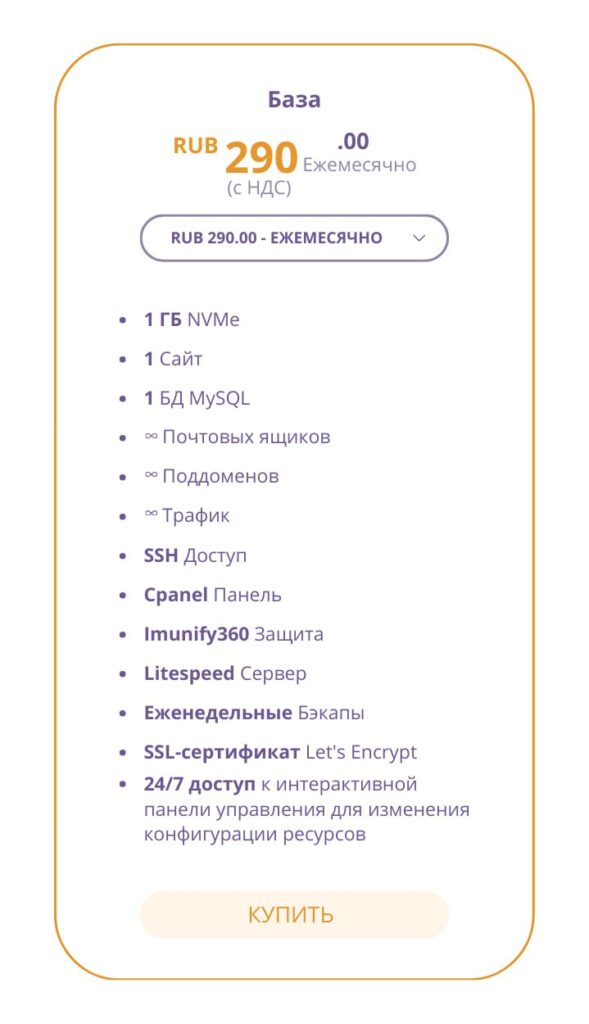Для начала работы с эластичным хостингом достаточно подключить базовый пакет стоимостью 290 ₽ в месяц (включая НДС). Он содержит оптимальный для работы сайта набор ресурсов, а по мере роста нагрузки дополнительные мощности подключаются через панель управления. Оплата формируется по итогам расчетного периода с учетом реально задействованных ресурсов, что позволяет начать с минимальных затрат и масштабировать хостинг без переплат.